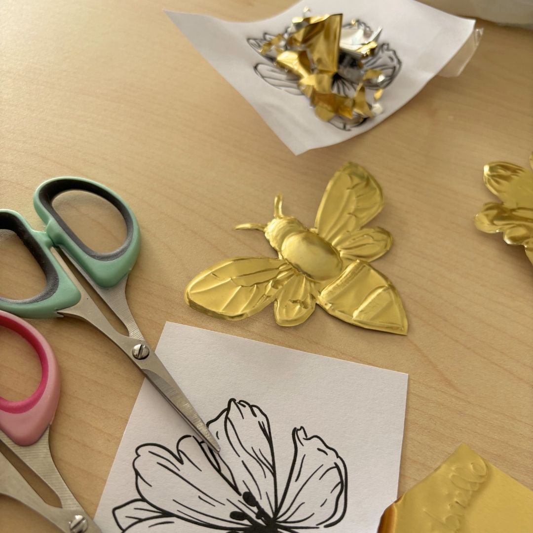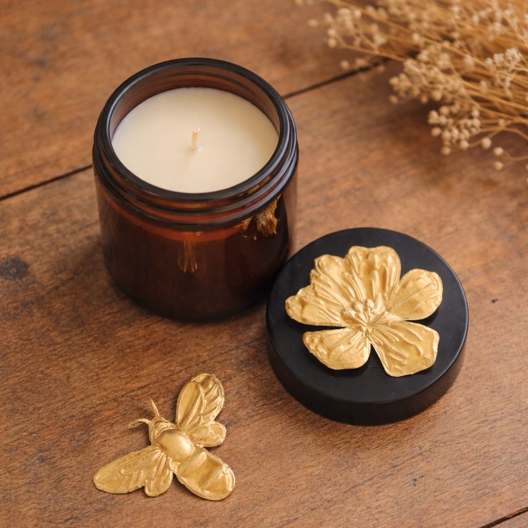 Tu réaliseras une bougie en cire végétale et de petites fleurs et abeilles en métal repoussé : tu pourras décorer le pot de ta bougie… ou les afficher où tu veux comme une mini touche de printemps chez toi.